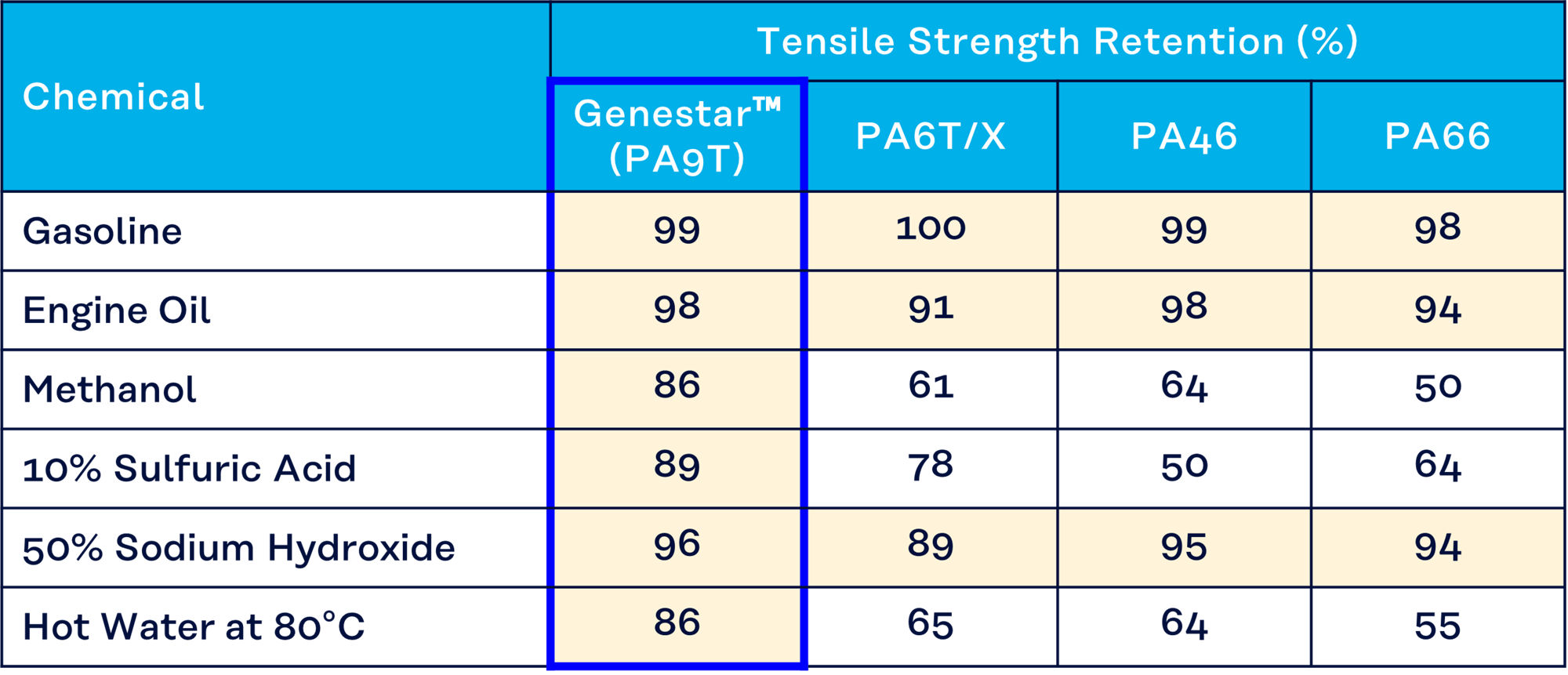 Genestar™ (PA9T) features exceptionally low moisture absorption and high crystallinity among polyamide resins, providing excellent chemical resistance. As a result, it offers high resistance to automotive fuels as well as acids and alkalis, contributing to improved durability of parts.
