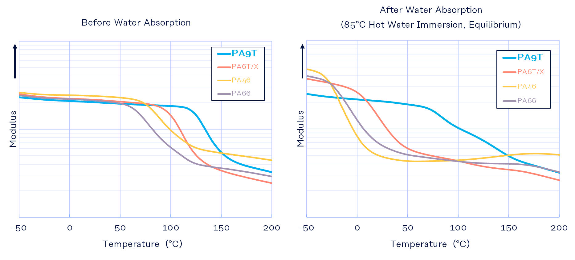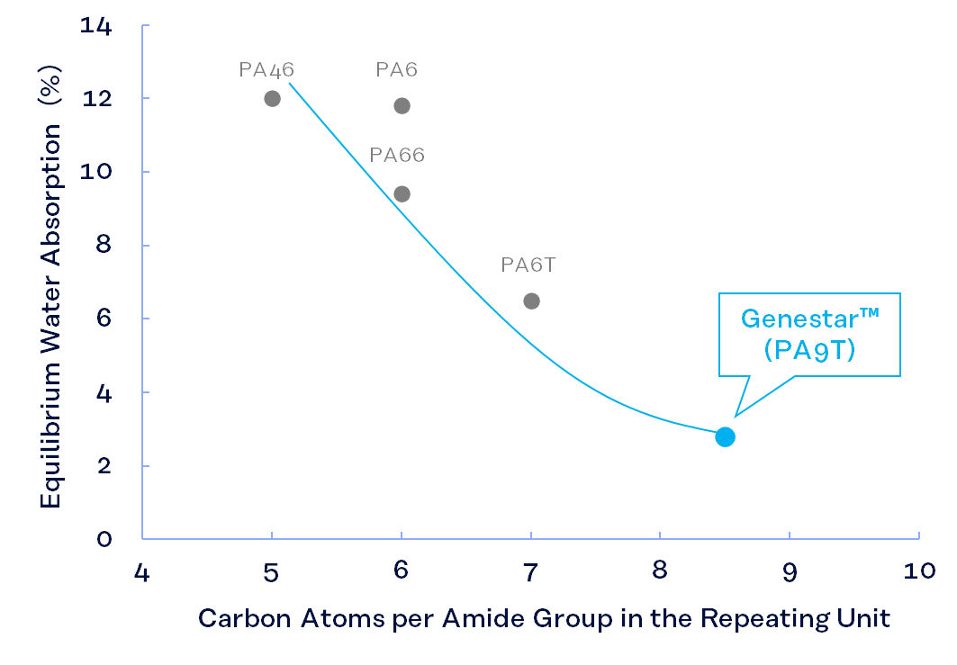 Genestar™ (PA9T) combines low moisture absorption and high crystallinity with a high glass transition temperature (Tg). This enables it to retain high mechanical strength even under high-temperature conditions or in environments exposed to hot water, contributing to improved long-term durability of parts.
