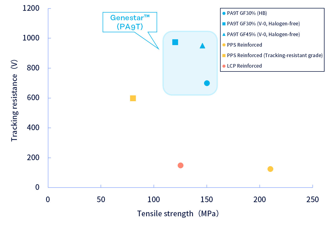 Genestar™ (PA9T) offers excellent tracking resistance while maintaining a superior balance with mechanical strength compared with conventional materials. This helps support the miniaturization, higher performance, and improved safety of high-voltage automotive electrical components required by increasingly advanced vehicles.