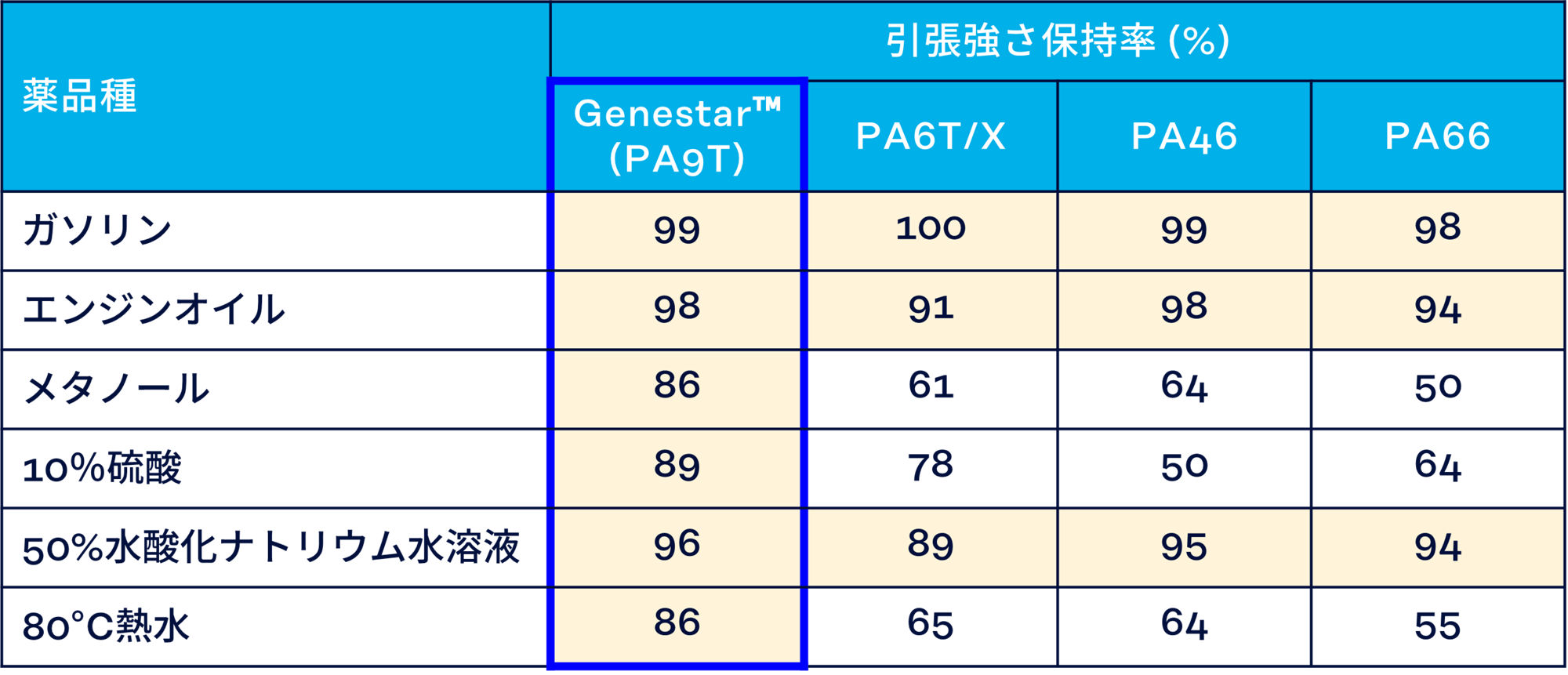 〈ジェネスタ®〉PA9Tは、ポリアミド樹脂の中でも極めて低い吸水性を有し、結晶性も高いため、優れた耐薬品性を示します。これにより、自動車に使用される燃料や酸・アルカリなどに対する耐性が高く、部品の耐久性向上に貢献します。