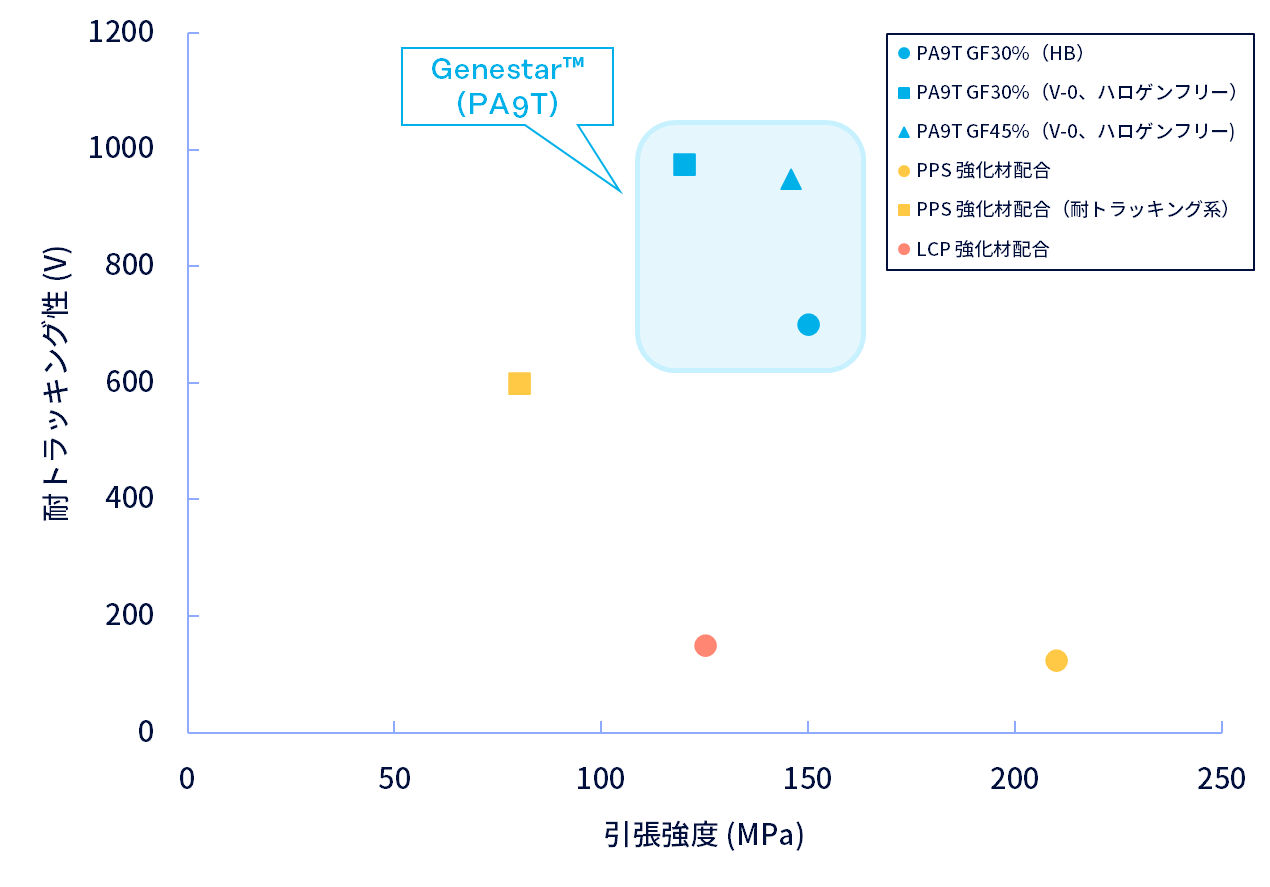 〈ジェネスタ®〉PA9Tは、優れたトラッキング特性を有し、従来材料と比較して高い強度とのバランスに優れています。