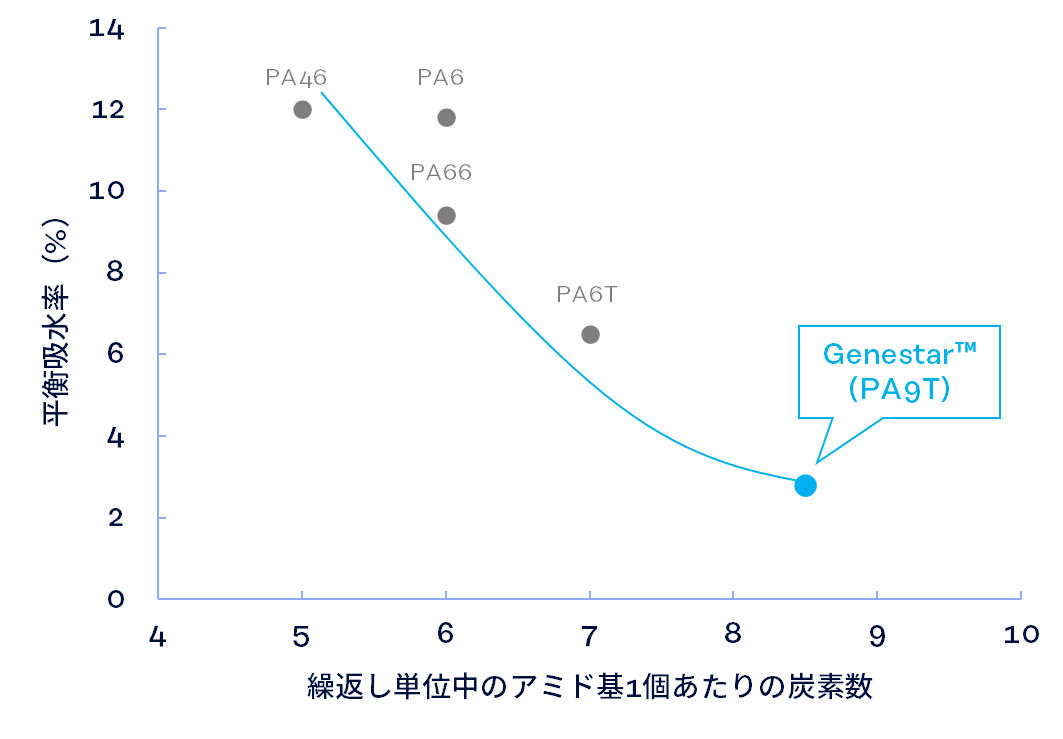 〈ジェネスタ®〉PA9Tは、自動車用機能部品に求められる長期耐熱性、耐薬品性、低吸水性、燃料バリア性に優れた、ポリアミド系エンジニアリングプラスチックです。