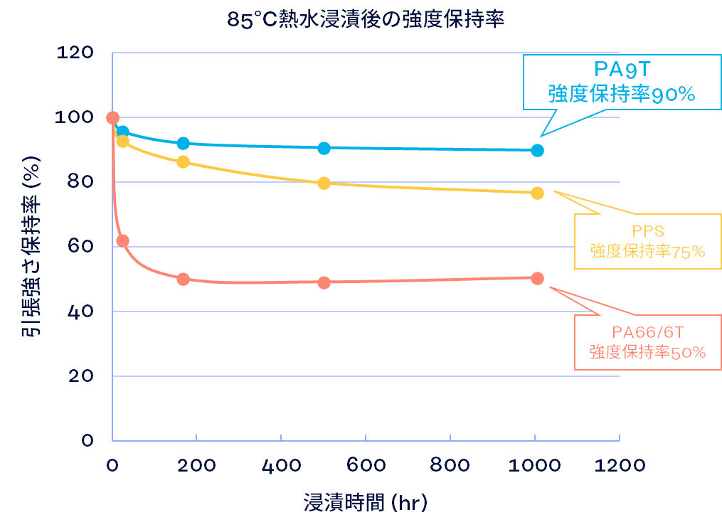 〈ジェネスタ®〉PA9Tは、ポリアミド樹脂の中でも高いレベルの低吸水性を持ち、ガラス転移温度も高いことから、優れた耐熱水性を示します。これにより、熱水に曝される環境でも強度を保持でき、部品の耐久性向上に貢献します。