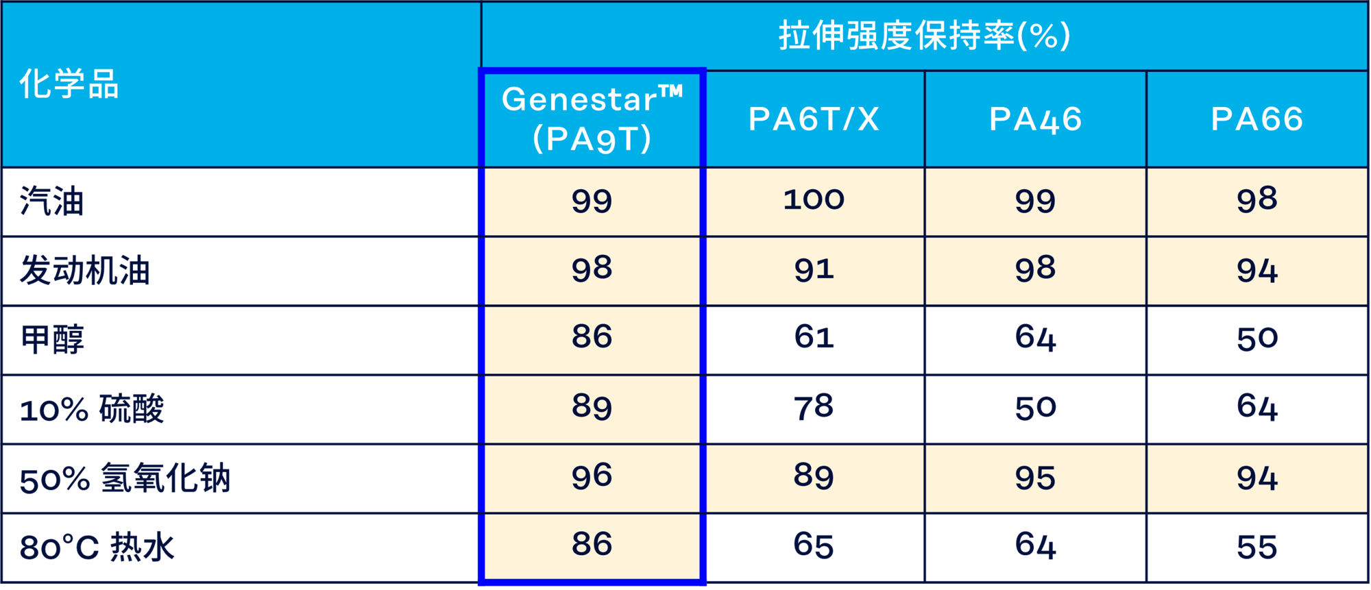 Genestar™(PA9T)在聚酰胺树脂中具有极低的吸湿性和较高的结晶性,因此表现出优异的耐化学性。由此,它对汽车中使用的燃油以及酸、碱等介质具有较高耐受性,有助于提升部件的耐久性。