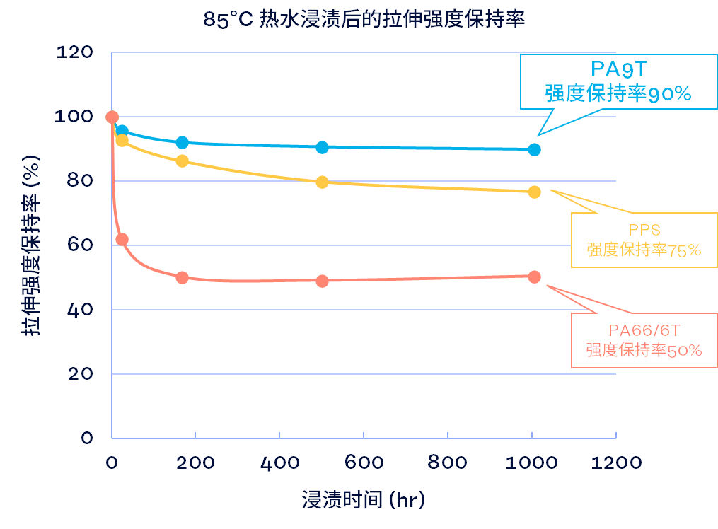 Genestar™(PA9T)兼具低吸水率与较高的玻璃化转变温度,因此在聚酰胺树脂中表现出优异的耐热水性能。即使在接触热水的使用环境下,也有助于保持机械强度并提升部件的长期耐久性。